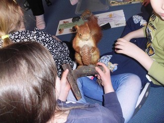 Wir konnten unter anderem einen echten großen und schweren Mammutzahn, ein Steinbeil, welches auch als Feuerstein nutzbar war, ein Fossil mit einem Abdruck einer Pflanze und ausgestopfte Tiere befühlen und bestaunen.