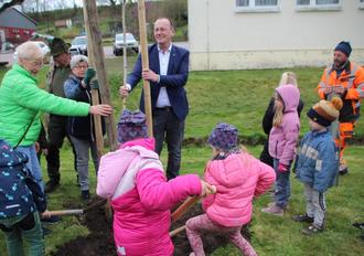 Zum "Tag des Baumes" am 25. April 2023 pflanzten Oberbürgermeister (OB) Sven Strauß, die Ortsbürgermeisterin von Rotha, Frau Heidrun Wodtke, Frau Ulrike Lange, Kreisvorstand Schutzgemeinschaft Deutscher Wald, und die Kinder aus der Kindertagesstätte "Spatzennest" den Baum des Jahres in der Straße "Rothaer Oberdorf".