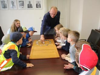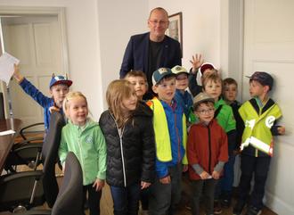 Die 10 Jungen und 2 Mädchen haben mit ihren Erzieherinnen Frau Katrin Heinemann und Frau Sandra Vollrath im Beratungsraum Platz genommen. Einige Kinder kannten den OB, oder wussten von ihren Eltern, was ein Oberbürgermeister ist. Nach einer kurzen Vorstellungsrunde ging es in die große Fragestunde. Der Eine oder die Andere haben sich bereits mit ihren Eltern Gedanken über das gemacht, was die zukünftigen Erstklässler wissen wollten. Artur ging es z. B. um Lieblingsfarben des OB`s, Moritz wollte wissen, welches Lieblingstier er hat. Klar ist jetzt: Der OB mag Rot und Orange und er mag Hunde. Aber es gab auch Fragen zu der Baustelle des ehemaligen Krankenhauses, wie viel Einwohner und Einwohnerinnen die Stadt Sangerhausen hat und zu den Spielplätzen.