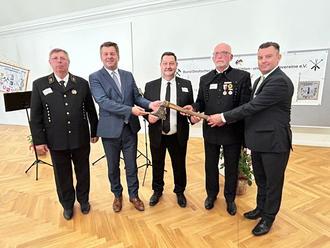 (Foto v.l.: Erich Hartung, Wirtschaftsminister Sven Schulze, Torsten Schweiger, Bernd Stahl und Landrat André Schröder)