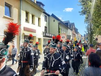 Nach dem Mittag formierten sich über 1400 Teilnehmer aus rund 100 Vereinen aus ganz Deutschland, der Schweiz, Österreich, Tschechien und Polen zur Bergparade, die sich - vorbei an begeisterten Zuschauern - durch die Innenstadt von Sangerhausen ins Friesenstadion bewegte.