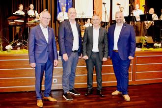 (v. l.: Festredner Reiner Heine, Sven Strauß, Landrat Andreas Siebert (Kassel), Erster Stadtrat Daniel Jung (Baunatal)