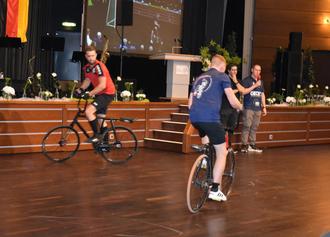 Mit einem Showprogramm begeisterten die Radsportvereine GSV Eintracht Baunatal und 2004 Sangerhausen e.V. das Publikum und das mit Sicherheit auch nicht zum letzten Mal. Vielen Dank dafür! Das war im warsten Sinne des Wortes ein einschlagendes Ereignis. Ein paar Gläser haben die Aktion nicht gut überstanden, aber beim Radball...