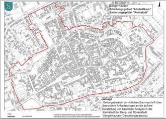 Die örtliche Bauvorschrift gilt für alle baulichen Maßnahmen im Sanierungsgebiet "Kernstadt Sangerhausen" und im Erhaltungsgebiet „Sangerhausen – Altstadtkern“.Das Gebiet ist in der anliegenden Karte in seiner Begrenzungslinie dargestellt.