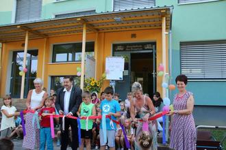 Foto: Schulleiterin Frau Cyris-Rudolf, Oberbürgermeister Torsten Schweiger, Kita-Leiterin Frau Hartmann und Erzieherin Frau Pietsch (v.l.n.r.) beim symbolischen Banddurchschnitt mit den Schülerinnen und Schülern.