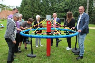 Dann war es so weit: Der Spielplatz wurde am 18. September 2023 u. a. vom OB, der Ortschaftsbürgermeisterin Sandra Biedermann und von Steffen Kühnemann, Sparkasse Mansfeld-Südharz (v.r.), zur Nutzung freigegeben. Der in der Ortsmitte befindliche Spielplatz wurde um einen Drehkreisel vom Hersteller „espas“ erweitert. Das Spielplatzgerät bietet neben Klettermöglichkeiten auch bis zur vier Kindern Platz, um Karussell zu fahren. Finanziert wurde das Spielgerät über Spendengelder der Sparkasse Mansfeld-Südharz in Höhe von 5.180 Euro. Vielen Dank dafür!