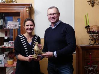 Bürgermeister Christian Runkel übergibt die Goethe-Friedenstaube an seine Haaner-Amtskollegin Dr. Bettina Wernecke