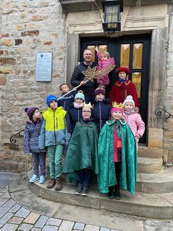 Die Sternsinger mit Bürgermeister Christian Runkel vor dem gesegneten Rathaus in Bad Lauchstädt