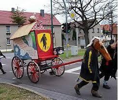 Die Kapelle begann zu schrummen. Der Lichtmeßzug setzte sich in Bewegung. Voran der Läufer, der Bändermann - die wohl prächtigste und den nahenden Frühling verkörpernde Figur, dann der Registrator, ihm folgend die sechs Lichtmeßältesten - die Küchenburschen mit ihren Küchenmädchen, schließlich wohlgeordnet all die anderen streng nach Vorschrift kostümierten Lichtmeßfiguren: Handelsmänner und Guckekastenmann, Vögel, der Milchkannen- und die Wurststangenträger, Kornweib, Schnurrradmann, Soldaten, Schwarzmacher, Pritscher und Eierfrauen. Der Erbsbär schüttelte an der Kette des Bärenführers bedrohlich sein zu eng gewordenes Winterfell, stößt wild brummend in die Menge. Die zweibeinigen Pferde zogen, angetrieben vom Kutscher, symbolisch und Funken sprühend einen Pflug zu Felde.