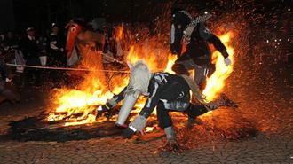 Die zweibeinigen Pferde springen um das Lichtmeßfeuer