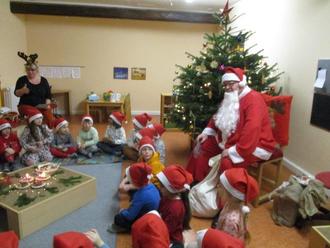 Am Donnerstag, 14.12.2023 fand dann die Kinder-Weihnachtsfeier statt. Ganz gespannt und aufgeregt warteten die Kinder auf den Weihnachtsmann. Er hatte alle Hände voll zu Tun. Als jedes Kind seinen Weihnachtsbeutel hatte, holte der Weihnachtsmann noch ein paar Säcke mit Geschenken herein. Alle waren so liebevoll von den Muttis eingepackt. Vielen Dank dafür! Dann zog der Weihnachtsmann noch einen neuen Trettraktor und ein schönes Rutschauto herein. Darüber freuten sich die Kinderaugen sehr.
