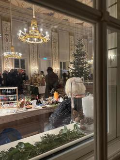 Blick durch das Fenster des Kursaals auf den stattfindenden Kunsthandwerkermarkt