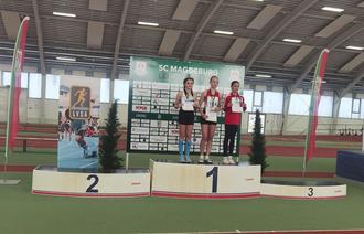 Johanna (Teutschenthal), Luise (Halberstadt) und Mathilda (Dessau) bei der Siegerehrung der Hallen-Landesmeisterschaften im Mehrkampf (v.l.n.r.)