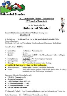 Bei der 15. Auflage des regionalen Hallen-Fußball-Turnieres für Alte-Herren-Mannschaften um den Wanderpokal vom Hühnerhof Steuden werden am Sonntag, den 16. Februar 2025 ab 9:00 Uhr in der Schafstädter Germania-Sporthalle werden wieder viele Freunde des Hallenfußballs erwartet. Aus unserer Goethestadt nehmen die Alten-Herren-Teams von der SV Germania Schafstädt und der LSG Klobikau-Milzau 1899 teil. Freuen Sie sich auf spannende Spiele.