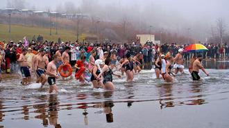 Eisbader auf dem Sprung ins kalte Wasser des Geiseltalsees