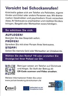 Bitte bleiben Sie aufmerksam und überprüfen Sie im Zweifel immer selbst, wer wirklich am Telefon ist. Die wichtigsten Warnhinweise und Verhaltenstipps finden Sie auf den beigefügten Informationsplakaten.