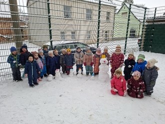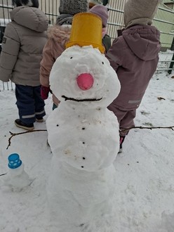 Unsere kleinen Schmetterlinge und großen Fische präsentieren stolz ihre selbst gebaute Schneemann-Familie