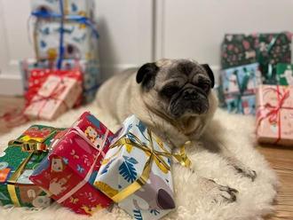 Mops mit Weihnachtspäckchen