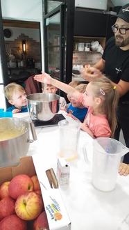 Die Vorschulkinder besuchten im Rahmen des Kennenlernens verschiedener Berufe und das Berichten über die Berufe ihrer Eltern. So besuchten sie auch die Tortenmanufaktur, wo sie gemeinsam mit Herrn Schindler einen Apfelkuchen gebackt haben.