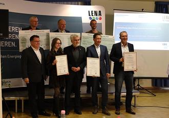 Prof. Dr. Armin Willingmann - Minister für Wissenschaft, Energie, Klimaschutz und Umwelt des Landes Sachsen-Anhalt (VM) und Marko Mühlstein, Geschäftsführer der LENA (VL) mit den drei Preisträgern