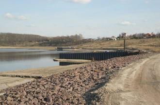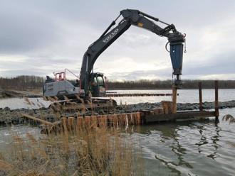 Einbau von Steinen als Ufersicherung beim Hafenbau in Braunsbedra