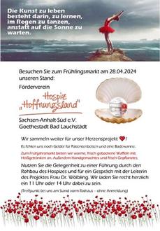 Am 28. April 2024 wird der Förderverein des Hospizes wieder auf dem Frühlingsmarkt vertreten sein. Wir wollen alle Besucher über den aktuellen Stand des Baus informieren. Dazu werden die neusten Baustellenbilder ausgestellt. Zusätzlich gibt es die Möglichkeit im Rahmen einer Führung um 11:00 Uhr und 14:00 Uhr mit Frau Dr. Wölbling die Baustelle zu begehen und jede Menge Fragen zu stellen.