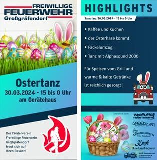 Der Förderverein Freiwillige Feuerwehr Großgräfendorf e.V. lädt am Samstag, den 30. April 2024 in der Zeit 15:00 bis 24:00 Uhr recht herzlich zum Ostertanz am Gerätehaus ein. Es erwartet Sie Kaffee und Kuchen, Fackelumzug und Tanz mit Alphasound 2000. Natürlich kommt auch der Osterhase vorbei. Der FV FFW Großgräfendorf e.V. freut sich auf Ihren Besuch.