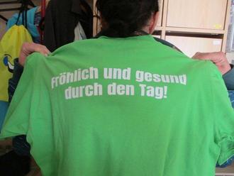 Die Rückseite der T-Shirts wurde mit dem Motto der Kita „Fröhlich und gesund durch den Tag“ versehen