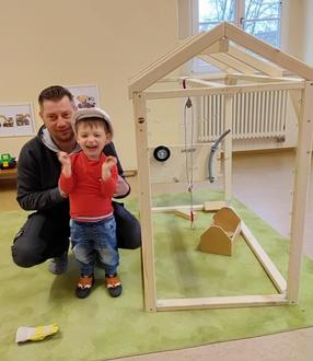 Schnell wurde jedoch klar: Etwas Besonderes fehlt noch. Ein Aktionshaus! Da ein solches nicht einfach zu kaufen war, war die Freude umso größer, als ein engagierter Papa die Idee aufgriff und mit viel Leidenschaft ein individuelles Aktionshaus entwarf. Gemeinsam mit den Kindern baute er es direkt im Bauraum auf.