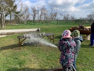 Die meisten notwendigen theoretischen Kenntnisse erlernten die Kinder bereits im Sachunterricht und in den Projektstunden in der Schule. Auf dem Gelände der Feuerwehr fanden diese Anwendung. Als erstes sahen die SchülerInnen die Schutzausrüstung eines Feuerwehrmannes, durften diese anfassen und den Helm anprobieren. Anschließend übten sie die richtige Anwendung der stabilen Seitenlage als mögliche Hilfsmaßnahme im Notfall. Ein nachgebautes Modellhaus mit Rauchmeldern verdeutlichte optisch, wie schnell sich Rauch in einem Haus verbreiten kann und wie wichtig die Anbringung eines sicheren Warnsystems ist. Alle installierten Fehlerquellen, welche ursächlich für einen Brand sein können, konnten von den Kindern entdeckt werden. An einer weiteren Station erkundeten sie die Fahrzeuge, welche im Brandfall zum Einsatz kommen. Toll war, dass alle in einem Feuerwehrauto Platz nehmen durften. Besonders aktiv waren die Kinder bei der Löschübung, doch statt eines echten Feuers zielten sie mit dem Schlauch auf Dosenpyramiden. Hier kam es vor allem auf Kraft und Treffsicherheit an.