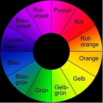 Links vom Grün liegt Blau und rechts Gelb, welche zusammengemischt das Grün ergeben. Zwischen Gelb und Purpur liegt dann Gelbrot, zwischen Blau und Purpur Blaurot.