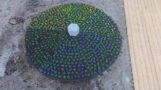 Angriff genommen. Durch Mitarbeiter des städtischen Bauhofes unserer Goethestadt wurden die Arbeiten vor Ort unter Anleitung der Landschaftsarchitektin Ulrike Schmeil vollzogen. Gleichzeitig wurde die Firma Blumen Meinhardt GmbH aus Landsberg / OT Niemberg mit der Lieferung der Pflanzen beauftragt. Die Bepflanzung führte die Firma CityGärten UG entsprechend „Goethes Farbkreises“ aus. In jedes der sechs Segmente wurden 120 Stück Stiefmütterchen (Viola F1) in den Farben Orange, Rot, Gelb, Hellblau, Dunkelblau und Weiß, anstelle von Grün, da es diese Farbe bei Stiefmütterchen nicht gibt, eingepflanzt, so dass in diesen sechs Segmenten eine flächendeckende Bepflanzung erzielt werden konnte.