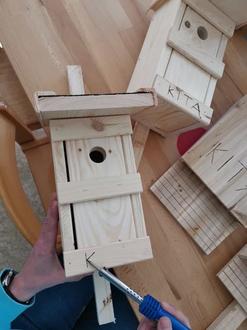 Mit Holzbrettern, Schrauben, Bohrmaschine, Schraubendreher, Stichsäge, Hammer, Maßband, Nägeln, Schleifpapier und Bleistiften ging es los. Zuerst zeichneten die Kinder Sägeschnitte auf die Holzbretter und ließen es von Herrn Beßler zuschneiden. Danach glätteten sie die Seiten mit grobem Schleifpapier. Anschließend bauten die Kinder unter Anleitung die Nistkästen aus den vorbereiteten Teilen zusammen. Und nach der ganzen handwerklichen Arbeit ging es weiter: Bei einem Spaziergang suchten sie nach geeigneten Stellen zum Anbringen der Nistkästen in Absprache mit der Goethestadt Bad Lauchstädt. Ein herzlicher Dank dafür!