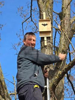 Hausmeister Thomas Beßler bringt einen Nistkasten für eine Fledermaus an einem Baum an