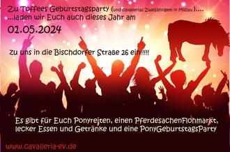 Am 1. Mai 2024 ab 11:00 Uhr laden wir Euch zu uns auf den Ponyhof zum PonyReiten, zum PferdesachenFlohmarkt und zur großen Toffee-Geburtstagsparty ein. Klein Toffee ist nämlich auf den Tag genau zu cavallerias Umzug am 1. Mai 2022 als erstes Pferd hier in Milzau geboren und ist nun ein stattlicher MiniPonyHengst von 70 Zentimeter Stockmaß.