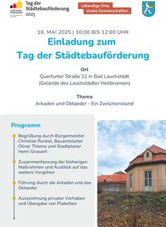 Der gemeinsam von Bund, Ländern, kommunalen Spitzenverbänden und weiteren Partnerinnen und Partnern getragene Tag der Städtebauförderung soll allen Programmkommunen der Städtebauförderung ein Forum bieten. Der Tag der Städtebauförderung ist seit 2015 eine jährlich wiederkehrende bundesweite Aktion in vielen Städten und Gemeinden, so auch in der Goethestadt Bad Lauchstädt.