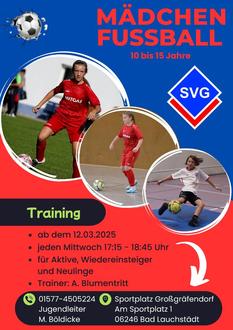 Wer Lust hat mitzumachen, kann gerne beim Mädchentraining am Mittwoch, vom 17:15 bis 18:45 Uhr auf dem Sportplatz Großgräfendorf vorbeischauen. Ob Aktive, Wiedereinsteiger oder Neulinge – alle sind herzlich willkommen!
