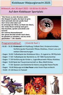 Am 30. April 2025 laden wir euch herzlich zur traditionellen Walpurgisnacht auf den Sportplatz in Klobikau ein.