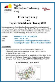 Der „Tag der Städtebauförderung“ ist eine gemeinsame Initiative von Bund, Ländern, Deutschem Städtetag und Deutschem Städte- und Gemeindebund. Als gemeinschaftliche Aufgabe von Bund, Ländern und Kommunen unterstützt die Städtebauförderung seit 1971 die Städte und Gemeinden, nachhaltige Lösungen für die Zukunft zu entwickeln, ein attraktives Lebensumfeld und ein gutes