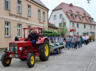 Dazu versammelten sich die Lauchstädter pünktlich um 18:00 Uhr auf ihrem Markt. Unter musikalischen Klängen des Spielmannszuges der Freiwilligen Feuerwehr Bad Lauchstädt, unter Leitung von Thomas Werner, und ordentlichem Gedöns der wunderbar sanierten Traktoren des Delitzer Schleppervereins und des Klobikauer Clownmobils von Horst Köhler wurde der Lauchstädter Maibaum vorgefahren. Begleitet wurde der Maibaum von den Pfingstburschen aus Schotterey, Delitz am Berge und Klobikau. Nach Vorfahrt des Baums wurde dieser in traditionell händischer Weise auf dem Markt von den Burschen aufgerichtet und mit den Wappenschildern der Vereine vervollkommnet. Gegen 18:30 Uhr konnten der Bürgermeister der Goethestadt Christian Runkel und der Ortsbürgermeister Lauchstädt Norbert Schindler lautstark verkünden: Maibaum steht!