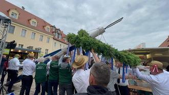 Mitglieder der Pfingstvereine stellen den Maibaum in Handarbeit auf
