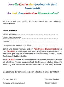Gemeinsam mit den Kindern bepflanzten sie, wie im vergangenen Jahr, 30 Blumenkästen mit insektenfreundlichen bunten Blütenpflanzen. Die Kinder durften die Kästen mit nach Hause nehmen und können sich mit diesen auch am diesjährigen Blumenschmuckwettbewerb beteiligen. Idee ist, dass die Kinder die Blumenkästen den Sommer über pflegen und auch noch weiter verschönern und dekorieren. Am Ende des Sommers sollen die Kinder ein Foto ihres blühenden und gestalteten Blumenkastens per Mail unter runkel@stadt-bad-lauchstaedt.de einreichen. Die schönsten Blumenkästen werden von der Jury auf dem Herbstmarkt mit einem kleinen Geschenk prämiert.