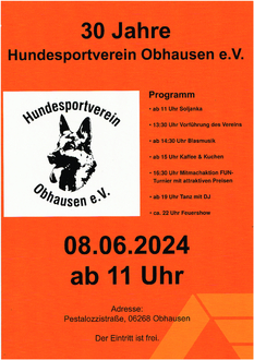 Am Samstag, den 08. Juni 2024 wird groß in Obhausen gefeiert. Unser Hundesportverein wird 30 Jahre alt und lädt alle zum mitfeiern ein.