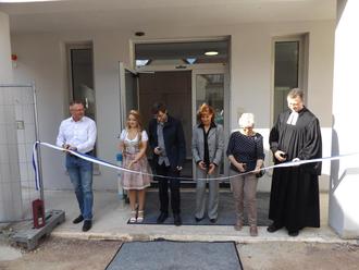 Ehrengäste durchschneiden das Band am neuen Rathaus