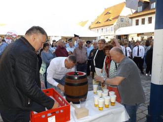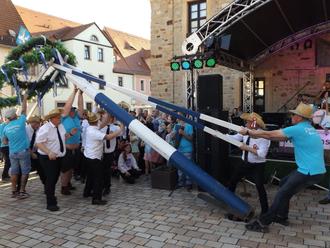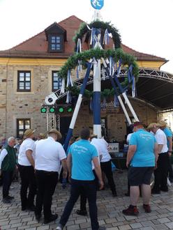 Im Anschluss an die Rathauseröffnung erfolgte das Aufstellen des Maibaumes vor dem alten Rathaus. Vertreter der drei Pfingstvereine aus Schotterey, Delitz am Berge und Klobikau legtes sich arg ins Zeug, damit der festlich geschmückte Maibaum auch in diesem Jahr wieder den Bad Lauchstädter Markt bereichert. Im Anschluss gab es ein kleieines Fass Freibier für alle Beteiligten.