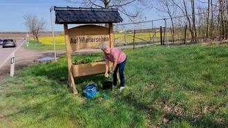 Ein Begrüßungsschild an einem Ortseingang wird bepflanzt