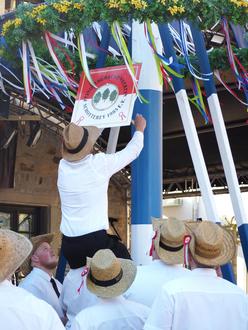 Die Pfingstburschen bringen die Wappenschilder ihrer Vereine an