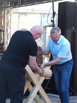 Der Fassanstich durch Bürgermeister Christian Runkel und Michael Röder