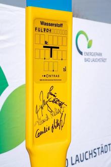 Markierungspfosten für Wasserstoff mit Unterschriften der Festredner
