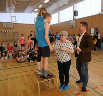 Annegret Helbig und den Bürgermeister Tilo Eigendorf. Beide überreichten auch den Bürgermeisterpokal für die beste Hochsprungleistung der Mädchen und den besten Grundschüler der Grundschule Teutschenthal bei diesem Hochsprung-Wettkampf.